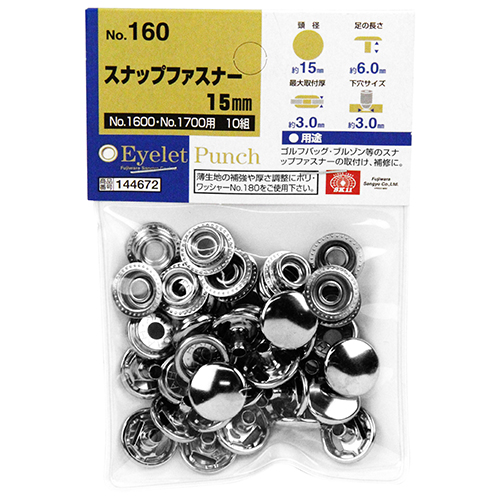 | 機能・特徴 | スナップファスナーパンチ(No.1600・1650・1700・1750)用の15mmスナップファスナーです。
