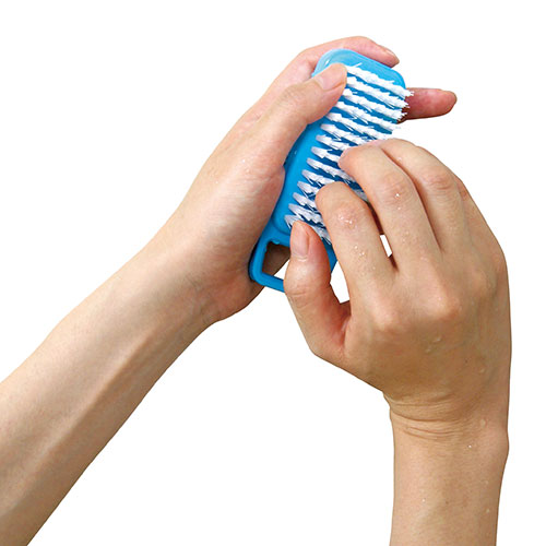 硬めのブラシを使って洗いますので、皮膚の柔らかい部分を洗うときは、力を入れずにやさしく洗うようにしてください。 こすっていて痛みを感じた場合は使用を中止して下さい。 |