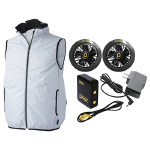 ●ウェア色:No.26(シルバー)。 ●連続使用可能時間:(表示1弱)約8時間・(表示2中)約6時間・(表示3中強)約4時間・(表示4強)約3.5時間。 ●ライトファン仕様:厚さ38mm・リング無直径83mm(75mm服穴径対応)・リング有直径102mm(90mm服穴径対応)。 ●ライトファン仕様:リング無重量62g/個・リング有重量86g/個・最大風量1.6m3/min。 ●ライトファン仕様:羽の枚数5枚・DC差込DC3.5(1.35mm)・ファン寿命約2000時間。 ●ライトバッテリー仕様:定格電圧7.4V・容量2600mAh・ワット時定格量(Wh容量)19.24Wh・入力電圧DC8.4V1200mA。 ●ライトバッテリー仕様:サイズH73×W56×D22mm・重量約124g・風量4段階切替・充電時間約3~3.5時間・充放電回数約500回。 |