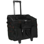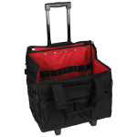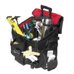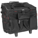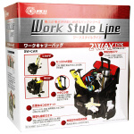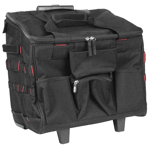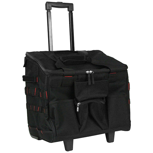 キャスター付で持運びが便利です。 ジッパー付のフタには伸縮生地の窓があるのでフタを開いた状態でも取っ手がのばせて持ち運べます、また水平器などがさせます。 表面生地は撥水処理を施しているので雨の日も安心して持ち歩けます。 腰袋、小物入れ(別売)なども取り付けられます。 |