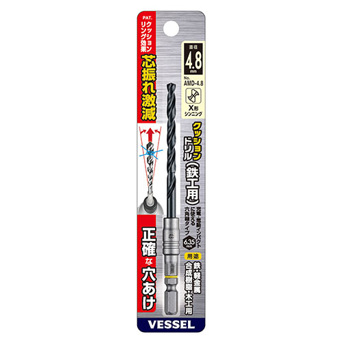 プレス結合刃先から六角軸までプレス加工で一体化しているので、ドリルが抜けることはありません。 アンビルにスムーズに入り、ボール溝に食い込みません。 高硬度HSS(ハイス)鋼で切れ味が落ちません。 X形シンニング採用により、センターポンチ不要で、軽い力で穴あけができます。 |
