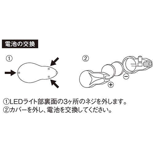 ●レンズ仕様:紫外線99.9%カット・くもり止め加工。 ●連続使用時間:50時間(アルカリ電池使用時)。 ●ボタン電池(CR2032)2個使用。 ●重量:60g。 ●テスト用電池付属。 |
