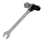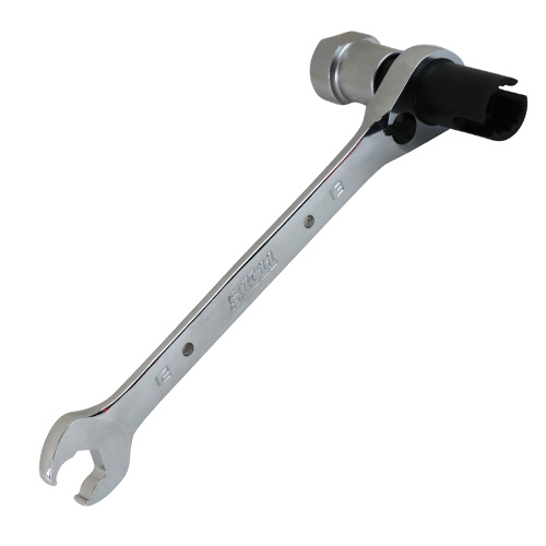 4サイズのボルト・ナット、蝶ネジに対応したサイズ切替式両口ソケットとスパナを装備し、ソケットの送り角も5度、と取り回しも抜群で1本あれば設備工事で大変便利です。 対辺17mmのソケット部分は二面幅は19.3mm前後、レースウェイ・ダクター内での作業が可能な二面割ソケット採用で、使用場所を選びません。 装備する12mmスパナは抜き差ししなくてもクイック廻しが可能なスピードスパナを採用しており、スピーディーな作業が可能です。 72山ギア採用で、細やかな動きで滑らかな操作性、狭所作業で威力を発揮します。 |