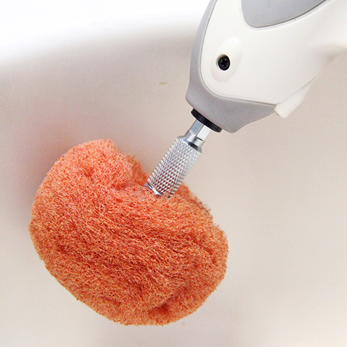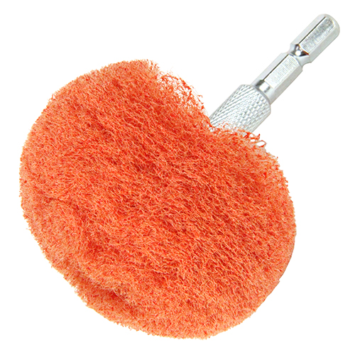 素材に深く傷を入れないたわしです。 中性洗剤、水等と併用して使用でき、軽く押し当てるだけで汚れを落とします。 繊維と砥粒が汚れをかき落とします。 ドリルやインパクトドライバー等の低回転工具にビット部分を差し込んで、汚れている部分を磨いて下さい。 |