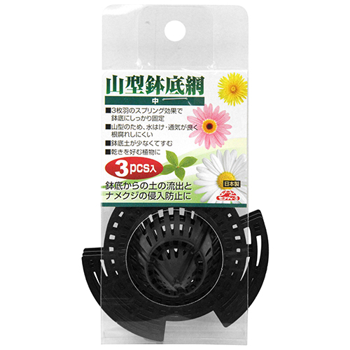 3枚羽のスプリング効果で鉢底にしっかり固定できます。 山型の為、水はけ・通気が良く根腐れしにくです。 鉢底土が少なくてすみ、乾きを好む植物に最適です。 |