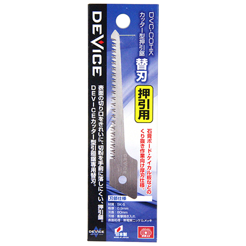 ●刃長:80mm。 ●刃厚:0.9mm。 ●刃部:衝撃焼き入れ。 ●表面処理:無電解ニッケルメッキ。 ●押引作業用。 ●適合本体:SK11(DEVICE)カッター型押引鋸DVC-COH。 ●適合本体:SK11(DEVICE)カッター型引廻鋸DVC-CHM。 |