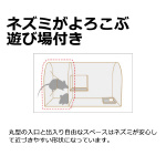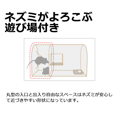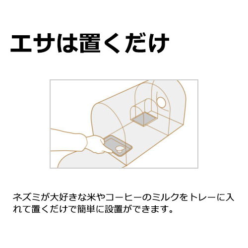 ネズミが大好きな米やコーヒーのミルクをトレーに入れて置くだけで簡単に設置ができます。 丸形の入口と出入り自由なスペースは、ネズミが安心して近づきやすい形状になっています。 ネズミは遊んでエサを食べているだけなので、周りの仲間がつられて入ってきます(ネズミが入口から入ることで、シーソーから落下します)。 |
