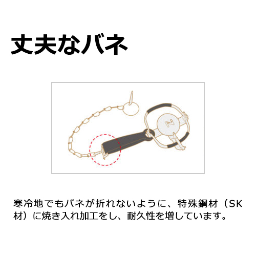 | 機能・特徴 | 寒冷地でもバネが折れないように、特殊鋼材(SK材)に焼入れ加工をし、耐久性を増しています。