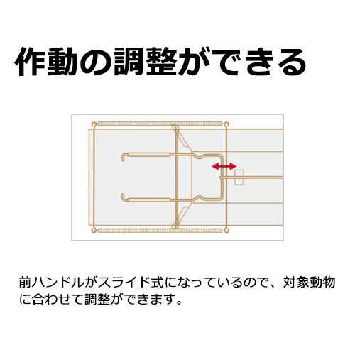 | 機能・特徴 | 前ハンドルがスライド式になっているので、対象動物に合わせて調整が出来ます。