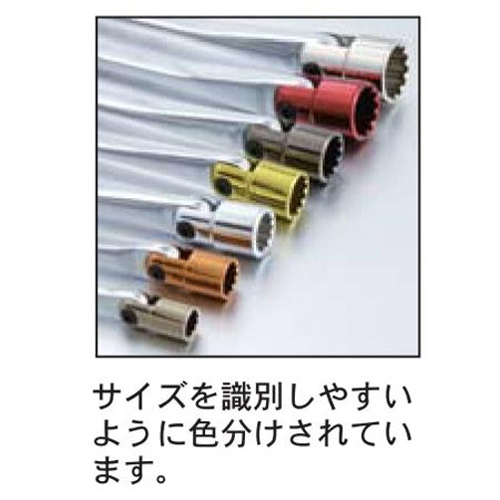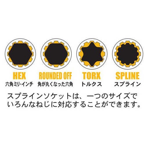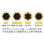 ソケット部は、スプライン形状で一つのサイズでいろんなネジに対応する事ができます。 サイズ識別がしやすいように、ソケット部を各サイズごとに色分けしています。 ストレートにしてドライバーハンドル感覚で作業ができ早廻し効果も抜群です。 |
