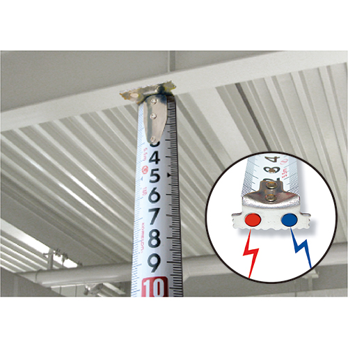 マグネットを吸着させてテープを手前に引いた時には、測定値から1.6mm減らして下さい。 感電の危険がありますので、電気との接触はしないでください。 |