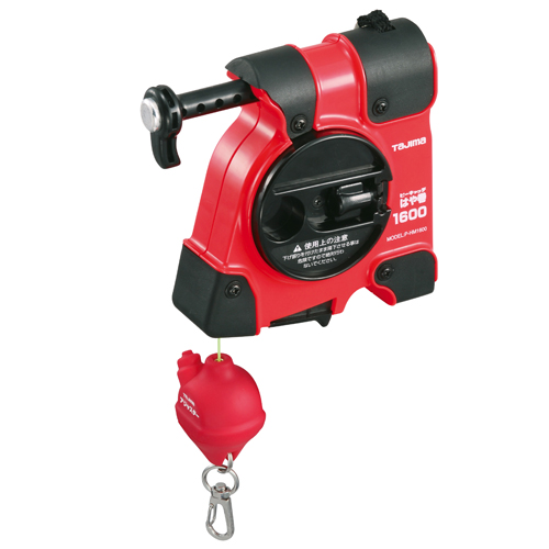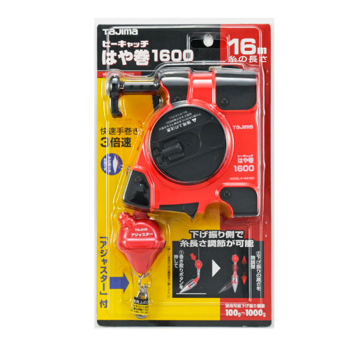糸のたるみを下げ振り側で巻き取り、高さ調整ができるアジャスター付です。 3倍速ハンドル手巻き(10mを15回転で巻き上げ)です。 本体を守るエラストマーを装着しています。 携帯に便利なストラップ付です。 |