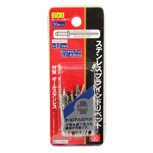 ●下穴寸法:3.3~3.4mm。 ●締付可能板厚:3.2~4.8mm。 ●引張強度:270kg。 ●剪断強度:210kg。 ●入数:30本入。 |