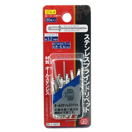 ●下穴寸法:3.3~3.4mm。 ●締付可能板厚:4.8~6.4mm。 ●引張強度:270kg。 ●剪断強度:210kg。 ●入数:30本入。 |