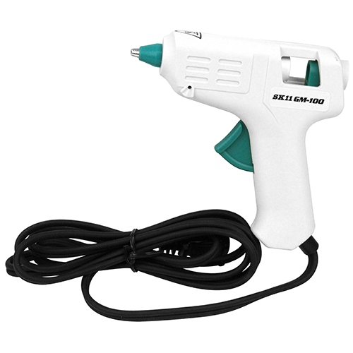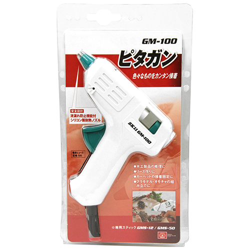 ●ノズル温度:160度。 ●電流ヒューズ:定格5A。 ●適合スティック(7.5mm径x100mm):GMS-12・GMS-50。 ●接着力:◎木材・紙・皮革・プラスチック(プラスチックによっては接着が弱いものがある)。 ●接着力:○金属・陶器・ガラス・プラスチック。 |