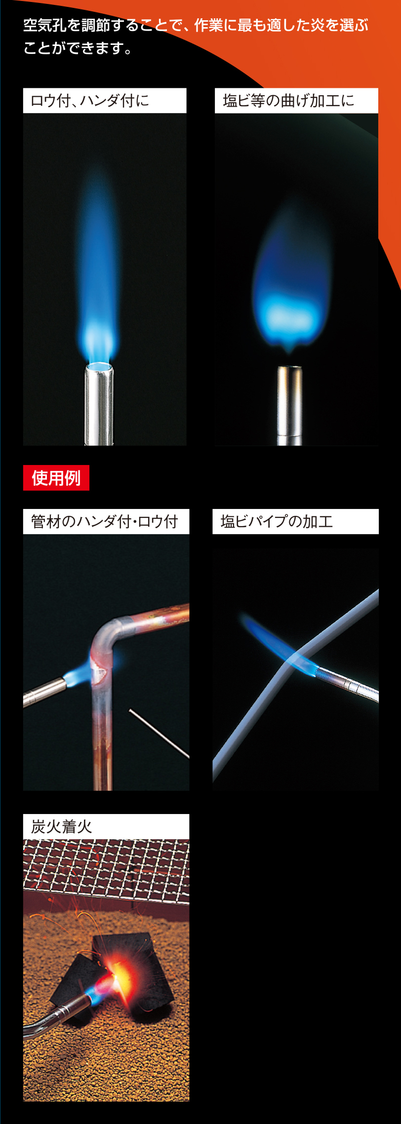 | 用途 | 炭火着火、塩ビパイプの加工、銅管のハンダ・ロウ付作業等。 |