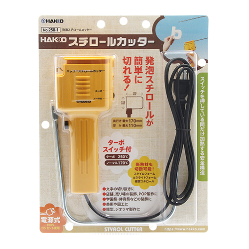 ターボスイッチ付で硬質スチロールも簡単に切断できます(ノーマル170度、ターボ250度)。 カッターナイフではできない曲線加工が簡単にできます。 発熱を知らせる通電ランプ表示付きです。 オートセーフティスイッチ採用で、スイッチを押している間だけ発熱します。 |