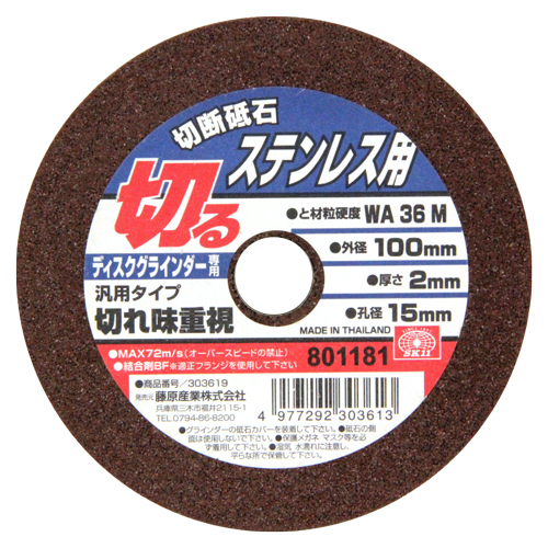 ●砥材・粒度・硬度:WA36M。 ●最高使用周速度:72m/s。 ●ディスクグラインダー専用。 |