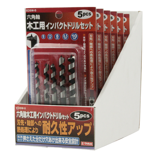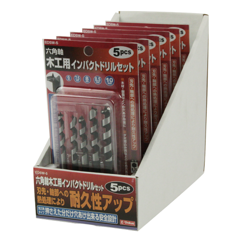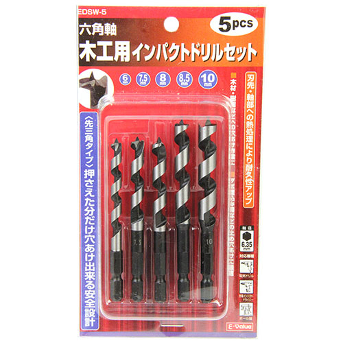 ●6.35mm六角軸。 ●対応機種:電気ドリル・充電インパクト・ボール盤。 ●5本組。 |