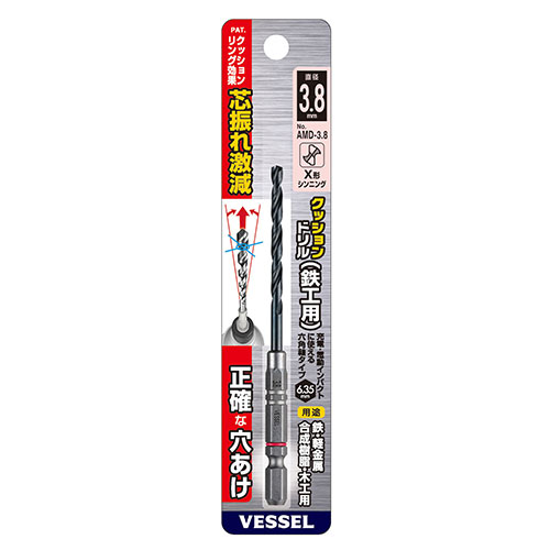 プレス結合刃先から六角軸までプレス加工で一体化しているので、ドリルが抜けることはありません。 アンビルにスムーズに入り、ボール溝に食い込みません。 高硬度HSS(ハイス)鋼で切れ味が落ちません。 X形シンニング採用により、センターポンチ不要で、軽い力で穴あけができます。 |