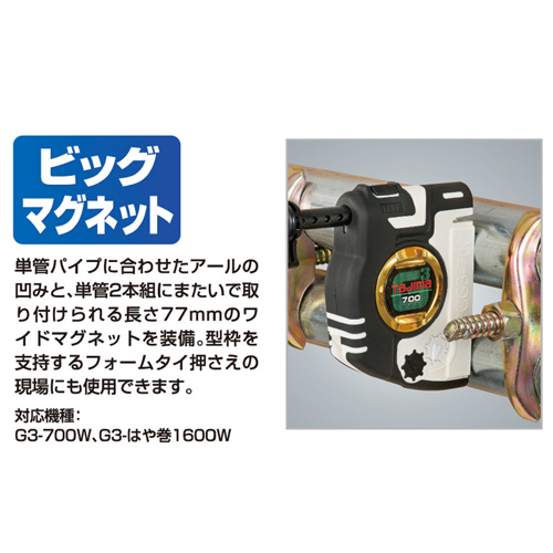 | 機能・特徴 | 弾力のあるエラストマー樹脂カバーでおおってあるため仕上げ面が傷付きにくく、また軍手で滑りにくい仕様になっています。