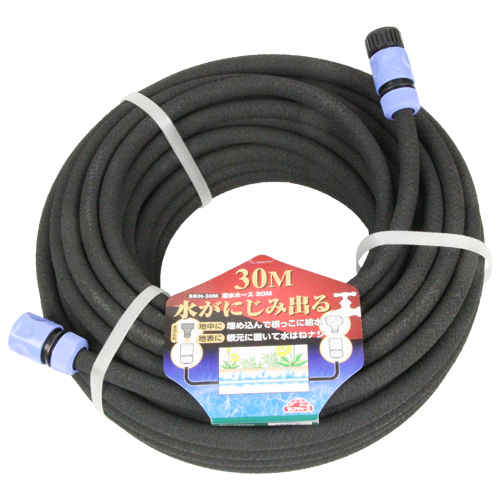 ホース全面より水がにじみだし散水します。 用途に合わせ地中に埋め込んだり、地表で根元に置いて使用します。 一般水道圧で灌水ホース能力限界長さの30Mタイプです。 |