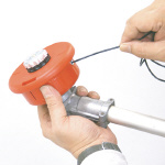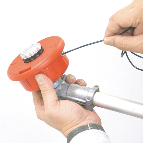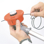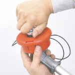 地面接地部は軽く強度に優れたアルミ鋳造ノブの使用により摩耗頻度が少なく安心して地面を叩くことができます。 叩き式タイプのため、コードが短くなると取り付けたまま底面のボタンを叩く様に押さえることにより、コードの繰り出しが簡単に行えます。 手回し、もしくはプラグレンチ13MMで簡単に回すことができます。 20ccの刈払機にもスムーズに使えます。 |