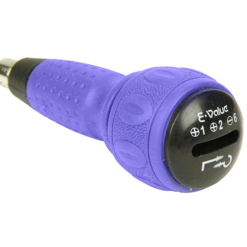 プラス刃先は+1・+2の兼用形状、グリップエンドでの溝でヒートン・洋灯吊・洋折釘などの回し作業ができます。 ボール形状グリップを手のひらで包み込むことで、押しながら回しがしやすく、ネジ頭を潰さないようにネジ回し作業できます。 市販されている六角対辺6.35mmのビットが使用出来ます。 |