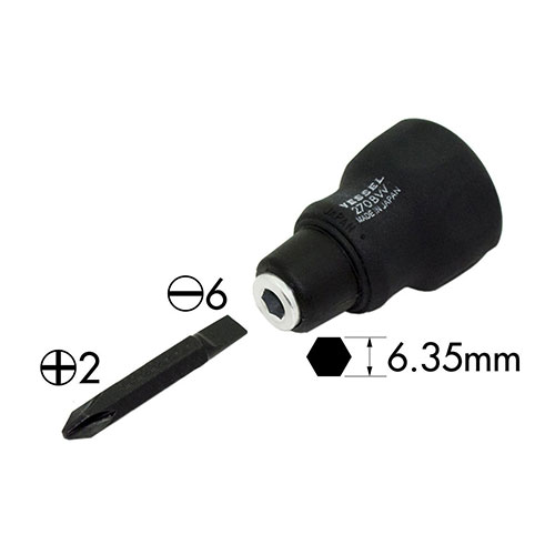 ●マグネット入。 ●環境対策品。 ●ビット:-6×+2・45mm。 ●グリップサイズ:長さ55.5mm・径35mm。 |