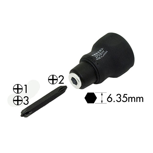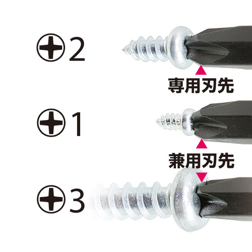 | 機能・特徴 | 使用頻度の高いプラスネジに対し、プラス1番、2番、3番を一本にて対応可能な両頭ビット付属の差替スタビードライバーセットです。 |