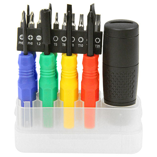 ●セット内容1:プラスドライバー(+1、+2)。 ●セット内容2:マイナスドライバー(-1.8、-2.5、-4、-6)。 ●セット内容3:ビット(+00、+0、-1.2、T4、T5、T6、T8、T10、T15、T20)。 ●セット内容4:キリ、ビットドライバーハンドル。 |
