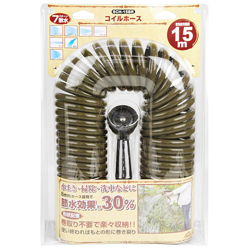 コイルタイプなので、使い終わればすぐ元に戻ります。 藻が発生しにくいホースを採用しています。 散水ノズルは7パターンです。 |
