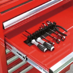 ローラーキャビネットなどの側面に張り付けて使用も可能です。 厚みのある収納物が多い場合はクリップを減らして使用できます。 |