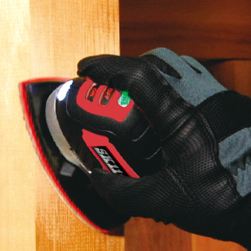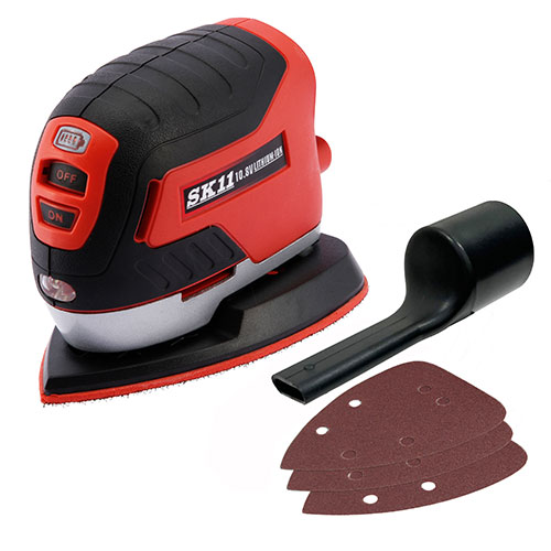 材料表面の研磨作業だけでなく、パッド先端部で狭く小さい部分やコーナー部の研磨作業が可能です。 バッテリー残量表示LED灯を装備しています。 白色LED作業ライト機能付きです。 ベルトドライブ採用で、ギア式と比べて低騒音・低振動です。  |