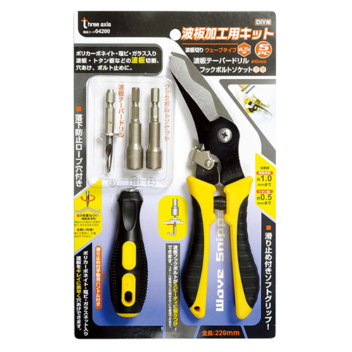 落下防止付きロープ穴付きです。 滑り止め付きソフトグリップを採用しています。 波板フックボトルがスピーディーに取り付け出来ます。 波板テーバードリルできれいに素早く穴あけ作業が出来ます。 |
