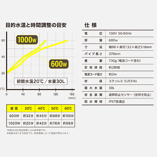 ●最低水位:10cm/最高水位:34cm。 ●最大水量:30L。 ●電源コード:2m(アース線あり)。 ●温度過昇防止装置(空焚き防止)付き。 ●PSEマーク認証。 |