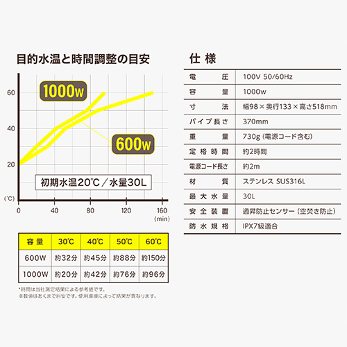 ●最低水位:10cm/最高水位:34cm。 ●最大水量:30L。 ●電源コード:2m(アース線あり)。 ●温度過昇防止装置(空焚き防止)付き。 ●PSEマーク認証。 |