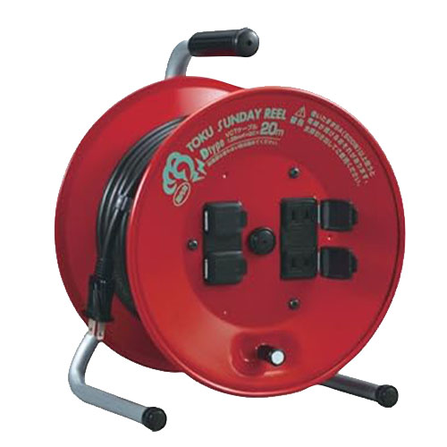 ●電線仕様:VCT1.25mm2×2C。 ●コンセント形状:2P×4個。 ●製品定格:125V5A(巻いたまま使用できる定格)。 ●質量:3.9kg。 ●コンセント防塵扉付。 |