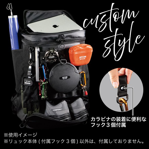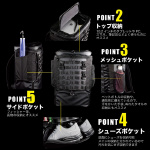 上部に10.2インチのタブレットやPC、スマホ、筆記用具などよく使うものを収納することができます。 フィッシャー等、長物の収納にオススメなサイドポケット付きです。 メッシュポケットは、ペットボトルの収納や、通気性に優れているので、汗をかいた手袋、塗れたタオルの収納にもオススメです。 底面にシューズを収納することができ、メインの収納と分かれているので汚れを気にせず収納できます。 |