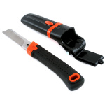 ケースと一体にベルト掛けができ、ナイフの出し入れがとてもスムーズです。 本体は滑りにくく使いやすいゴムグリップ製で、ケースは衝撃に強いプラスチック製です。 VVFケーブルの割線・皮むき機能付です。 収納ケースにロック機能を採用しています。 |