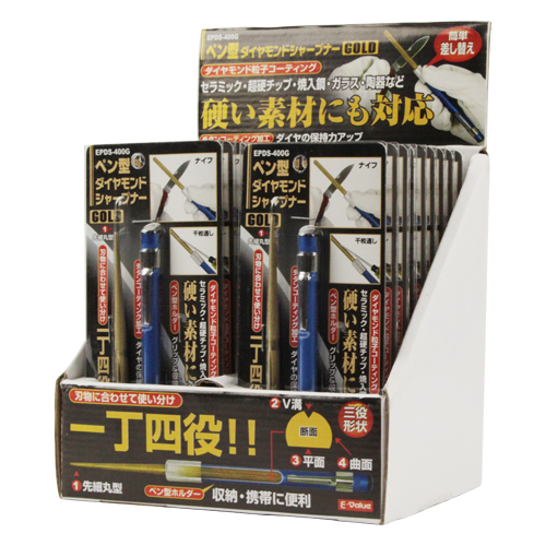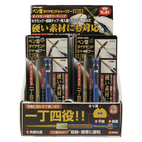 収納・携帯に便利なペン型グリップです。 表面にはチタンコーティングメッキを施しており、ダイヤモンド粒子の保持力をアップしました。 |