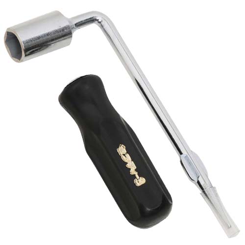 レンチ後部の尖った先で、草刈刃取り付けナット周りのゴミ、土などを取り除けます。 ネジは左ネジ仕様になっています。 |
