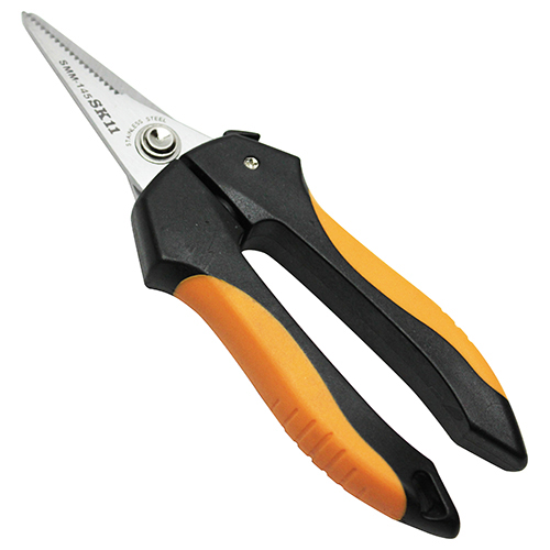 さびにくいステンレスブレードです。 セレーション刃で、切る物を逃さずスムーズにカットできます。 滑りにくいラバー付グリップです。 ブリキ、アルミ、プラスチック、布、紙、ビニール、アルミ線、針金などの様々な素材をにカットできます。 |