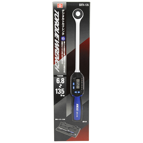 ●測定範囲:6.8~135N・m・精度保証範囲:27~135N・m。 ●測定精度:右ネジ±3%(左ネジ±4%(27N・m未満は±6%)。 ●測定単位:N・m(単位換算機能付きkgf・cm、lbf・in、lbf・ft)。 ●ラチェットギア数:52山。 ●電源:単4乾電池2本。 ●操作モード:ピークホールドモード、トラックモード。 ●最小目盛り:0.1N・m。 |