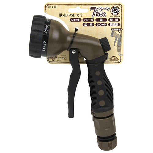 ●適合ホース内径:12~15mm。 ●適合ホース外径:20mmまで。 ●7パターン散水:ジェット・シャワー(外)・霧・整流・広角・シャワー(中)・横拡散。 ●水流調節ねじ付。 |