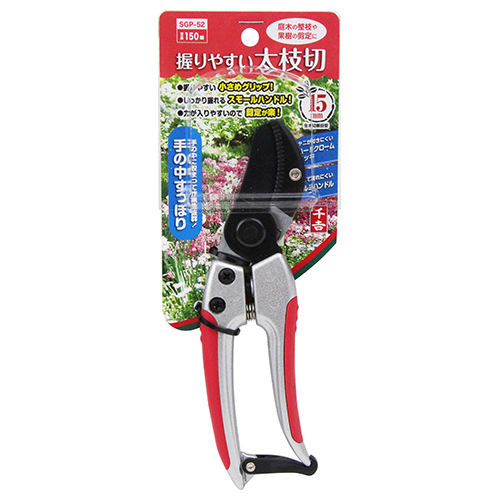 握りやすく、滑りにくい樹脂グリップ付です。 刃はヤニが付きにくいハードクロームメッキ仕様です。 庭木の整枝や果樹の剪定に最適です。 握りやすく、しっかり握れる小さめのグリップハンドルです。 |