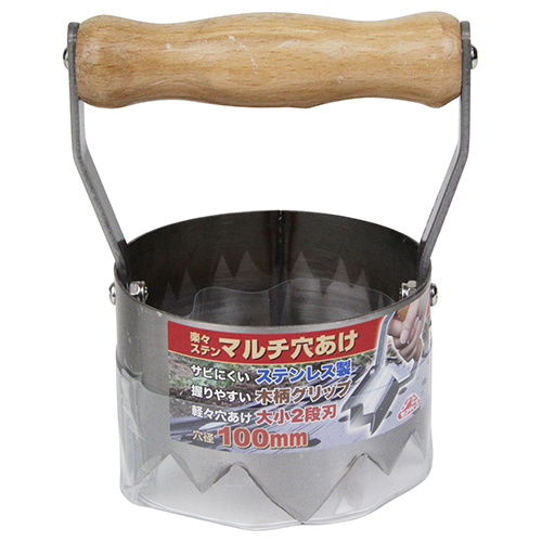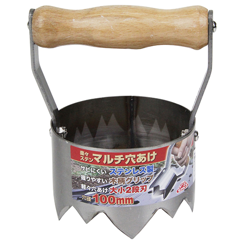 刃部はサビにくいステンレス製です。 力が入りやすく、握りやすい木柄グリップを採用しています。 大小2段刃のため軽い力で穴あけ作業ができます。 野菜苗・花苗・種まき用やイチゴ・レタス等の穴あけに最適です。 |