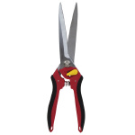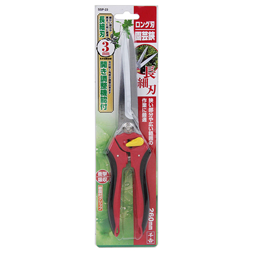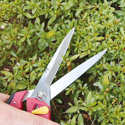 刃の開きは約40度と約20度二段階が可能です。 ヤニが付きにくくお手入れがしやすいハードクロムメッキ仕様です。 植木の間やブロックなどのキワ、奥まった場所でも使い易い細刃設計です。 底部保護設計で、地面に置いたままでも作業が行なえます。 |