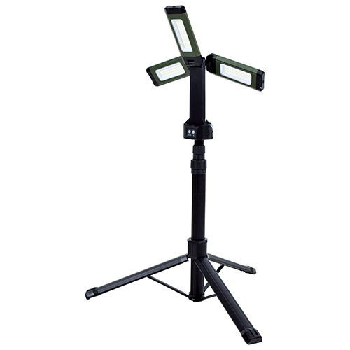 ●充電時間:約3.5時間(2A)/4時間(1A)。 ●防水性能:防雨型(※防水型ではありません)。 ●本体寸法:約幅610×奥行610×高さ1294mm(三脚セット時)。 ●重量:1.8kg。 ●最大光束:2000lm(HIGHモード)、1200lm(MIDモード)、700lm(LOWモード)。 ●照度(1m):300Lx(HIGHモード・白色)、325Lx(HIGHモード・昼光色)。 ●連続点灯時間:2時間(HIGHモード)、4時間(MIDモード)。 |