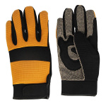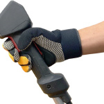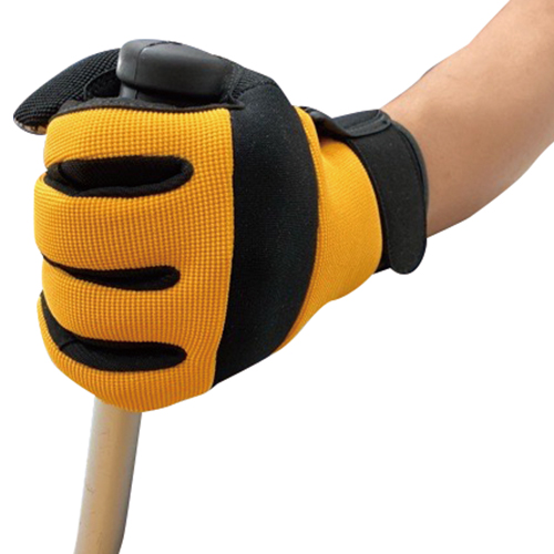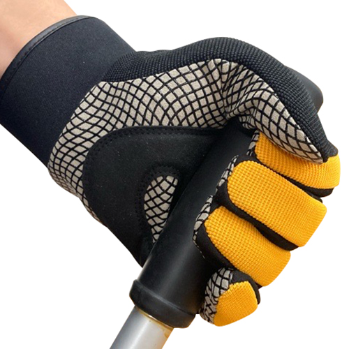 握り部分に滑り防止用シリコン搭載、刈払機をしっかり握ることが出来ます。 手の甲側には部分的にストレッチ素材を採用しました。 甲側が柔らかくなることで楽な握りを実現しました。 |
